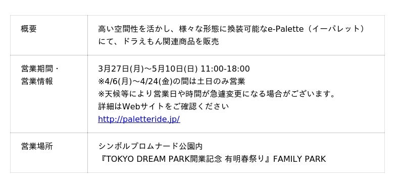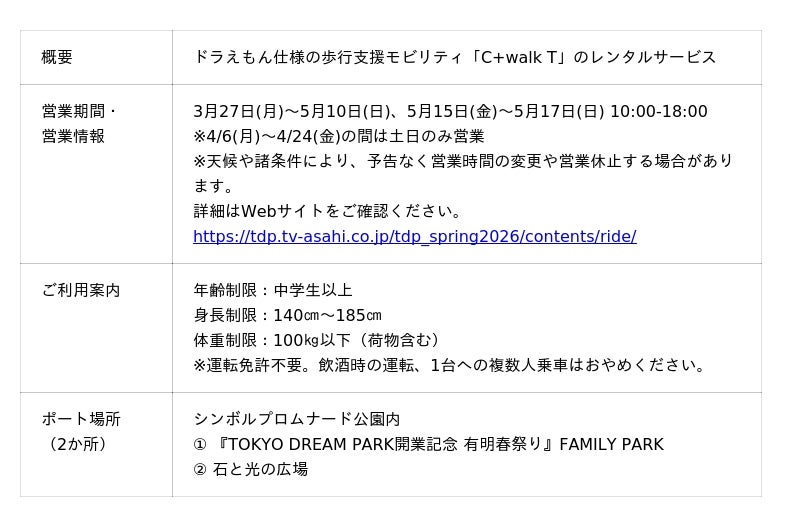 期間中は「PALETTE MARCHE」でドラえもん関連商品を販売するほか、東京ドリームパークと周辺拠点を繋ぐ移動手段としてトヨタの歩行支援モビリティ「C⁺walk T」のレンタルサービスも実施し、エリア全体でのコンテンツ連動と来訪者の回遊性向上から「移動総量増・移動時間減・エリアの笑顔増」に寄与したいと考えております。