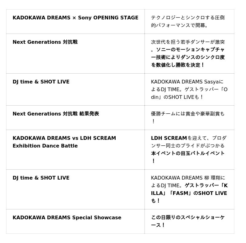 日本発のプロダンスリーグ「D.LEAGUE」のトップチーム KADOKAWA DREAMS と、世界をリードする ソニー の解析テクノロジーが融合。 本イベントは、ソニー株式会社主催のもと、テクノロジーがダンスの熱量を可視化し、エンターテインメントの枠を超えた没入体験をお届けするスペシャルステージです。