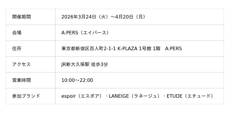 espoir・ LANEIGE・ETUDEなどアモーレパシフィックジャパンの 人気3ブランドがA:PERSでポップアップを開催!