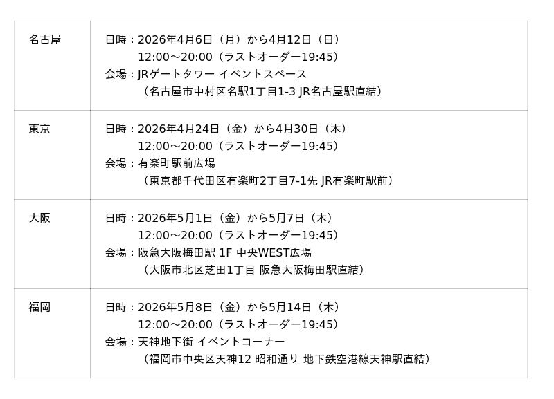 4月6日から名古屋、東京、大阪、福岡で順次実施