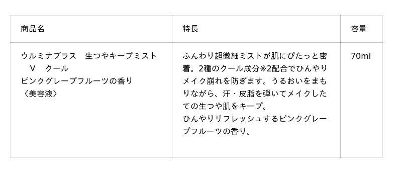 2021年3月より発売の『ウルミナプラス 生つやキープミスト』は、2025年3月にリニューアルし、高いメイクキープ力と保湿力のUPに加えて、霧が細かくなり密着感が増したことで多くのお客様からご好評いただいています。今年の数量限定発売のクールタイプは、ジューシーなフルーツの香りとハーバル感の掛け合わせで、今まで以上に爽やかさを感じられるピンクグレープフルーツの香り。