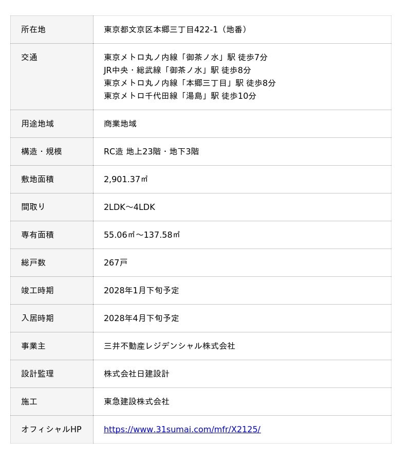 三井不動産レジデンシャル株式会社(所在:東京都中央区、代表取締役社長:嘉村 徹)は、東京都文京区本郷三丁目に建設中の分譲マンション「パークコート御茶ノ水 ザ タワー(以下、本物件)」の物件公式ホームページを2026年3月26日(木)に開設し、エントリーを開始したことをお知らせします。