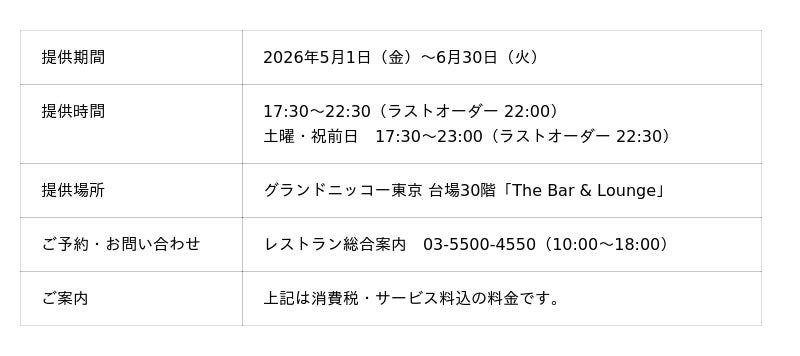 「東京を楽しむ 東京をくつろぐ」ひとときをお届けするグランドニッコー東京 台場(住所:東京都港区 総支配人:塚田 忠保)は、ホテル最上階から東京の夜景を一望できる「The Bar & Lounge」にて、みずみずしい果実とジンの風味を楽しむ『2種メロンとジン香る 初夏の締めパフェ』と、旬のフルーツを使ったカクテル3種『Early Summer Cocktail Selection』を、2026年5月1日(金)~6月30日(火)の期間限定で提供いたします。