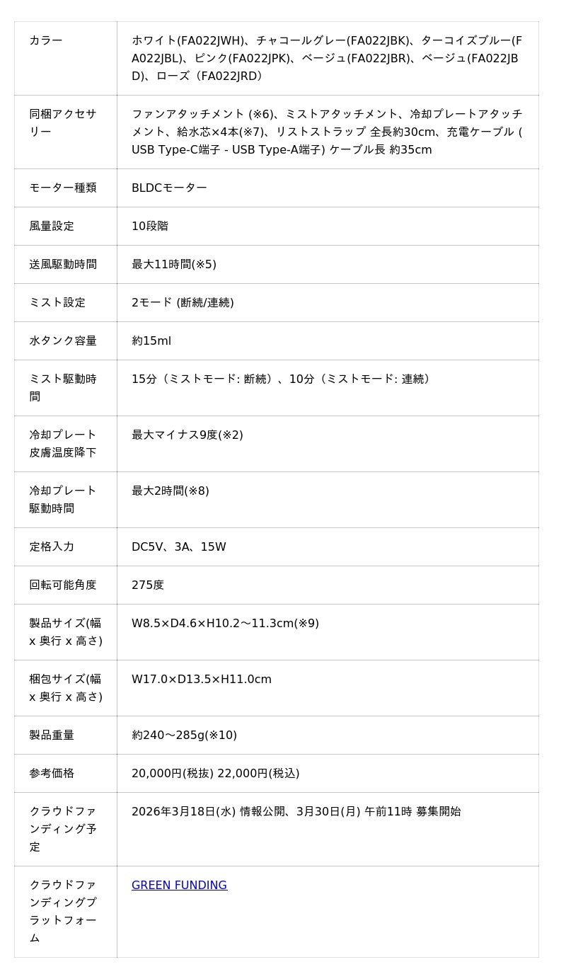 「Shark(R) ChillPill パーソナルクーリングファン」は、ファン・ミスト・冷却プレートの3つの冷却機能を備え、いつでも自分だけの涼しさを持ち運べるパーソナルファンです。2026年3月30日より「GREEN FUNDING」にてプロジェクトを開始し、わずか10分で数量限定の特別特典分が完売、目標を突破しています。その後も予想を上回る支援をいただき、開始24時間で支援人数が1,000人超え、支援総額は目標の9,000%越えを突破しています。