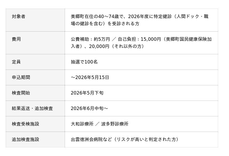 島根県美郷町在住の40~74歳の方を対象に、令和8年度の特定健診(人間ドック・職場の健診を含む)を受診される方の中から抽選で100名にマイシグナル検査を提供します。町内2カ所の診療所で手軽に受検でき、検査結果でリスクが高いと判定された方には、専門医療機関での追加検査まで一貫してサポートします。