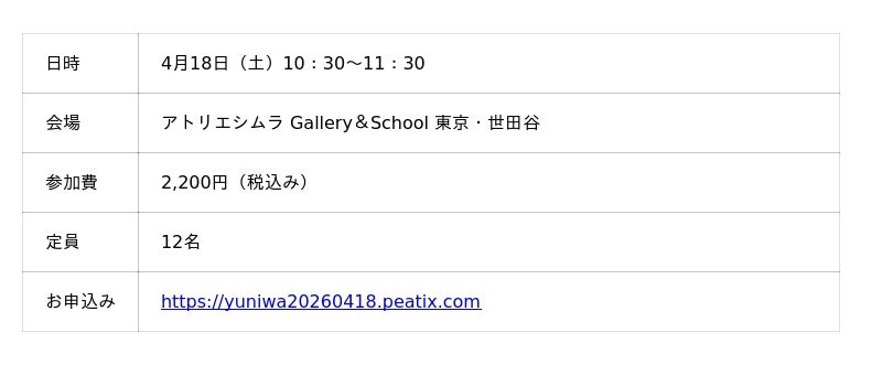 ギャラリーページ:https://www.atelier-shimura.jp/blogs/gallery/yuniwa-2026