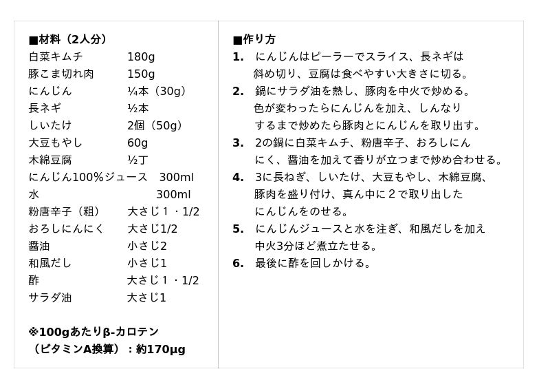・βーカロテン豊富なにんじんジュースで隠れジミ予防、水キムチの乳酸菌が摂取しやすく、毎日の美容習慣におすすめ。