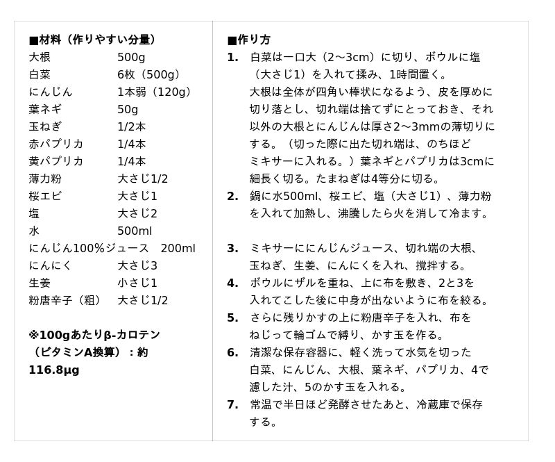 ・本レシピは発酵を伴います。調理前に手を清潔を洗い、保存容器、まな板を消毒することを 推奨いたします。