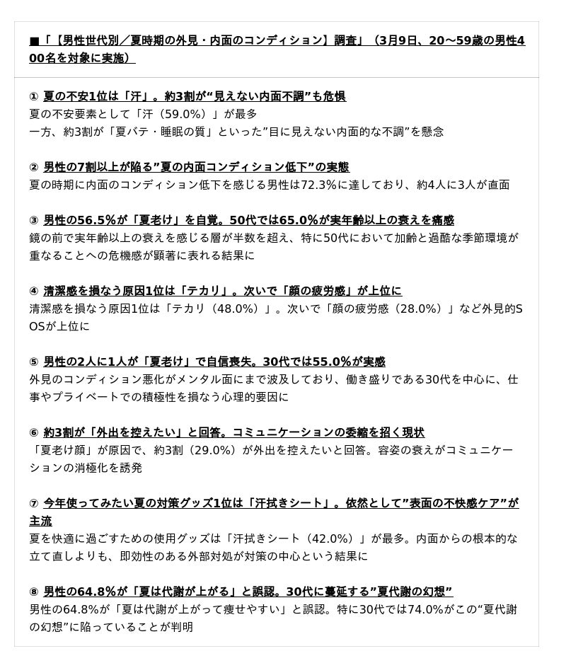■【男性世代別/夏時期の外見・内面のコンディション実態調査2026】まもなく猛暑が到来!「冷房漬け・代謝低下」が引き起こす男性の “夏老け顔” 問題とは?