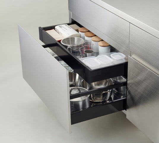 4.キャビネット内部の収納力を強化引き出しの上部を有効活用できる「内引出し」のオプションが加わりました。調理器具や調味料、保存容器などの収納に便利です。これに合わせて、包丁差しも従来のタイプからスリム化しました。