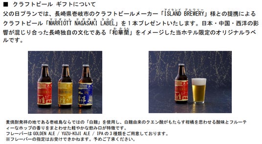 父の日プランでは、長崎県壱岐市のクラフトビールメーカー「ISLAND(アイランド) BREWERY(ブルワリー)」様との提携によるクラフトビール「MARRIOTT(マリオット) NAGASAKI(ナガサキ) LABEL(ラベル)」を1本プレゼントいたします。日本・中国・西洋の影響が混じり合った長崎独自の文化である「和華(わか)蘭(らん)」をイメージした当ホテル限定のオリジナルラベルです。