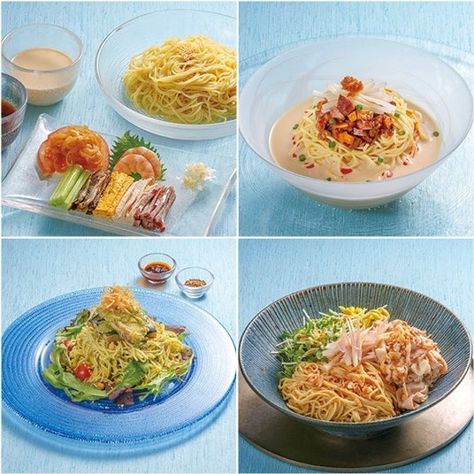 左上から時計回りに:桃花林冷麺、梁涼麺、きなこ豚しゃぶ肉の冷麺 胡麻風味、エゾアワビのバジル冷やし和えそば