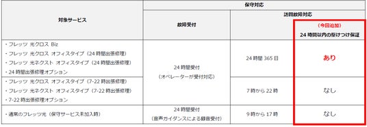 「フレッツ 光クロス オフィスタイプ」、「フレッツ 光ネクスト オフィスタイプ」、および「24時間出張修理オプション」等への「24時間以内の駆けつけ保証」の機能追加について