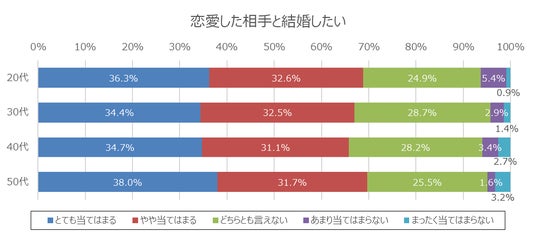 先ほどの質問でも、50代は恋愛した相手と結婚したいと考える割合が最も高い結果となりました。