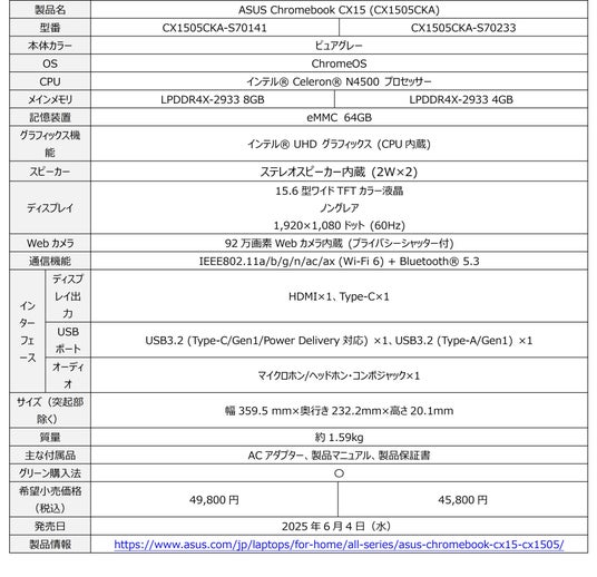 「ASUS Chromebook CX15 (CX1505CKA) 」は、2025年6月4 (水) より発売を開始します。