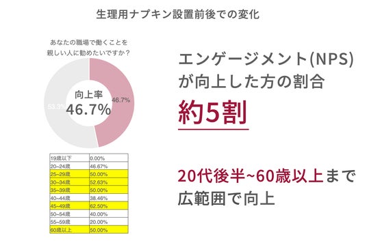 7.82%の向上が見られました。エンゲージメントが向上した方の割合は約5割で、特に20代後半~30代の向上率が高いという結果となりました。生理用品の設置とアンケート実施により、会社が女性の健康への配慮を示す姿勢が伝わり、従業員の会社へのエンゲージメントが向上したと考えられます。