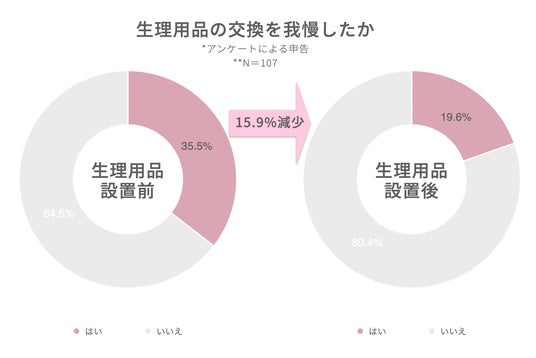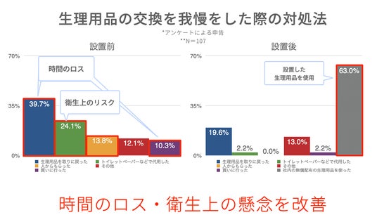 設置前は「生理用品を取りに戻った」(39.7%)、「トイレットペーパーなどで代用した」(24.1%)、「人からもらった」(13.8%)といった対応が取られていました。