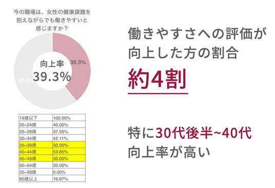 11.9%の向上が見られました。働きやすさへの評価が向上した方の割合は約4割(39.3%)で、特に30代後半~40代の向上率が高いという結果となりました。以前は生理用品を取りに戻ったり、トイレットペーパーで対処したりする必要がありましたが、設置後は手軽に利用できる環境が整い、時間の無駄や不安が減少したことで、働きやすさが向上したと考えられます。