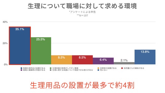 職場に求めるサポートに関する調査では、「無償の生理用品設置」が35.1%と最も多く、約4割の従業員がこの取り組みを求めていたことがわかりました。次いで、「生理休暇の取得がしやすい環境」(25.5%)や「休憩室の設置がある」「低用量ピルの補助がある」(8.5%)といった項目が続いており、職場における生理時のサポート体制の整備が求められていることがうかがえました。