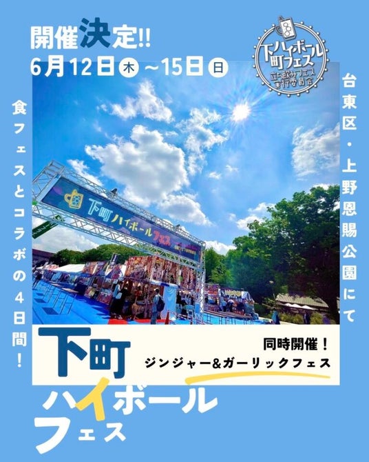 『下町ハイボールフェス2025 in 上野恩賜公園』では、下町ハイボール・日本酒ハイボール・ワインハイボールなど幅広いバリエーションのハイボールが楽しめ、さらにクラフトビールや日本酒を販売するブースも出展。お酒好きにはたまらないイベントです。「フードコート」には、ハイボールに合う下町グルメや、ジンジャー&ガーリックをテーマにしたメニューやスイーツなどが味わえ、カジュアルな立ち飲みスタイルで、お酒とお料理を味わう特別なひとときをお過ごしいただけます。