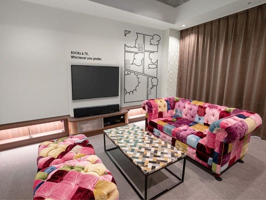 さまざまなジャンルの本が置かれ、ゲストの交流スペースでもある交差点「the crossroads」。配色豊かなラグにゆったりとしたソファが置かれた空間で、フリードリンクを片手におくつろぎください。