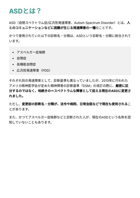 ASDの診断を受けている方はもちろん、ASDの診断は受けていないものの同じような悩みがある方、ASDのグレーゾーンのある方にも役立つ内容になっています。