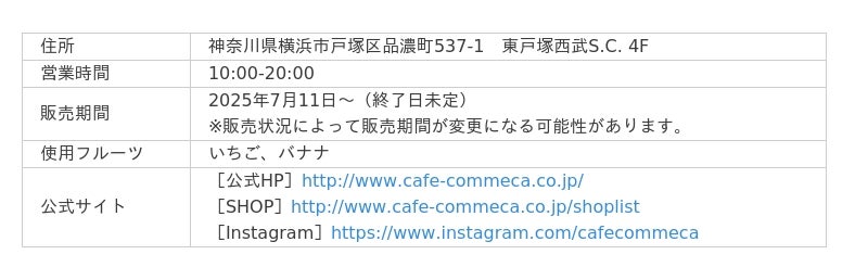 (株)コムサ(東京都渋谷区)が展開するカフェ業態「カフェコムサ」の、3店舗にてフルーツコーヒーを提供します。「カフェコムサ」は日本中・世界中の産地、農園から厳選した旬のおいしいフルーツを使用したスイーツなどを提供しており、日本の四季を感じられるアート感覚溢れるケーキを提供しています。いちご、パイナップル、バナナのフルーツコーヒーを提供予定です。いちごは栃木県産の「なつおとめ」を使用し、アレンジには産直いちごの生産・販売などを手掛ける「ベリーベリーとちぎ」が作るいちごシロップも使用します。またパイナップルは沖縄県の「TOK:iファーム」が作るパイナップルとパインジュースを使用したご当地フルーツコーヒーを提供します。