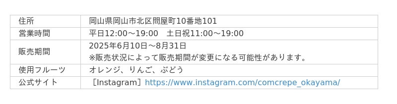 富山県発祥の人気クレープ店「コムクレープ」の岡山初上陸店舗。コムクレープの看板商品である「クレープブリュレ」をはじめ様々なクレープメニューを展開しており、「ミクレープ」シリーズでは、いちごやチョコレート、クリームチーズなどを使用したミルクレープ風のクレープが楽しめます。クレープでも使用しているこだわりのフレッシュフルーツのうち、ぶどう、りんご、オレンジを使用したフルーツコーヒーを提供します。