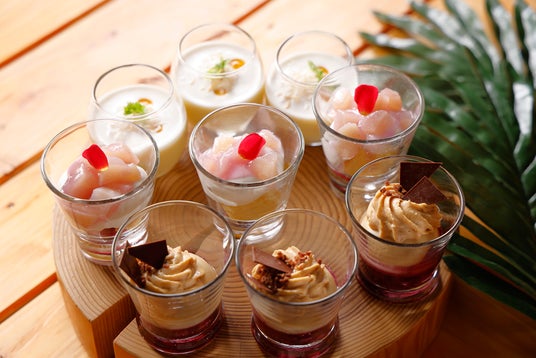 ジャンバラヤ/魚介と野菜のケイジャン和え/スイカのガスパチョ/茄子としし唐の南蛮漬け バルサミコ風味/枝豆とオクラのゼリー寄せ魚介のマリネ添え/白身魚のヴァプール ヴィエルジュソース/