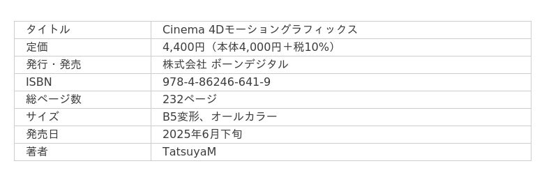 株式会社ボーンデジタル(本社:東京都千代田区、CEO:新 和也、URL:https://www.borndigital.co.jp)は、 『Cinema 4Dモーショングラフィックス』(著:TatsuyaM)を2025年6月下旬に発売いたします。