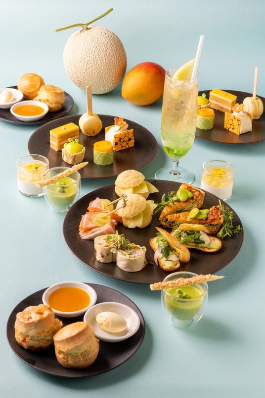 メロンをかたどったメロンチーズムースやオリジナルメロン&マンゴーモクテルマンゴーを花びらのように飾るメロンジュレを閉じ込めたココナッツムースなど「メロン&マンゴー アフタヌーンティー」が新登場