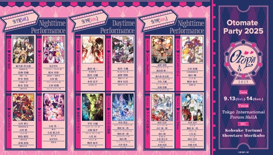 「オトメイト」の人気作品や新作が一堂に会し、同じ空間で世界観の異なる様々な作品を堪能できるキャスト登壇イベント「オトメイトパーティー」を国際フォーラム ホールAにて、2025年9月13日(土)[夜公演]2025年9月14日(日)[昼公演]/[夜公演]と、全3公演開催いたします。