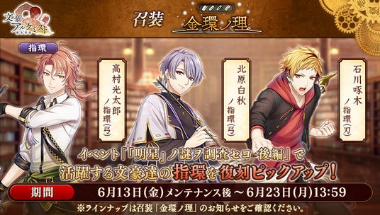 召装『金環ノ理』のラインナップを更新いたしました。この召装では、イベント『文史紀伝「『明星』ノ謎ヲ調査セヨ 後編」』で活躍する「北原白秋」「石川啄木」「高村光太郎」の指環を一定の確率で入手できます。
