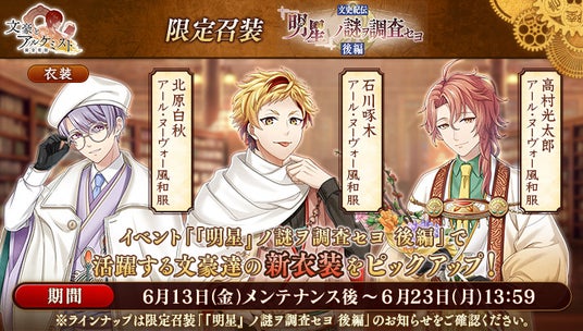 さらに、イベントと同時に開催される限定召装『『明星』ノ謎ヲ調査セヨ 後編』にて新規追加された「北原白秋」「石川啄木」「高村光太郎」の〈アール・ヌーヴォー風和服〉を編成すると、得点の獲得率がそれぞれ30%上昇します。