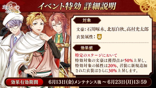 期間中「北原白秋」「石川啄木」「高村光太郎」の衣装を編成して潜書すると、得点の獲得数がそれぞれ50%上昇します。また、「土」属性の衣装を編成して潜書すると、得点の獲得数がそれぞれ20%上昇します。