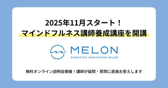 科学的なマインドフルネスを応用し、「心と感情の自己理解」を通じて、人々のウェルビーイングを支援する株式会社Melon(本社:東京都港区、代表取締役CEO:橋本大佑、以下MELON)は、2025年11月より講師養成講座を開講いたします。本講座を修了すると、「一般社団法人マインドフルネス瞑想協会認定講師」の資格を取得できます。