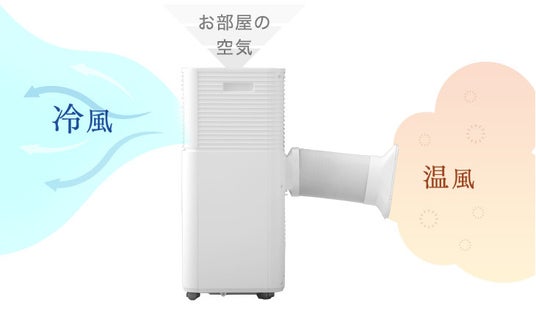 スポットクーラーとはエアコンに似た仕組みの冷房家電です。室内の空気を吸い込み、つめたい空気と暖かい空気に分けて排出する仕様になっています。スポットクーラーはエアコンに比べ、専門業者にお願いしなければならない面倒な取り付け工事が不要でお届け後すぐに使用することができます。