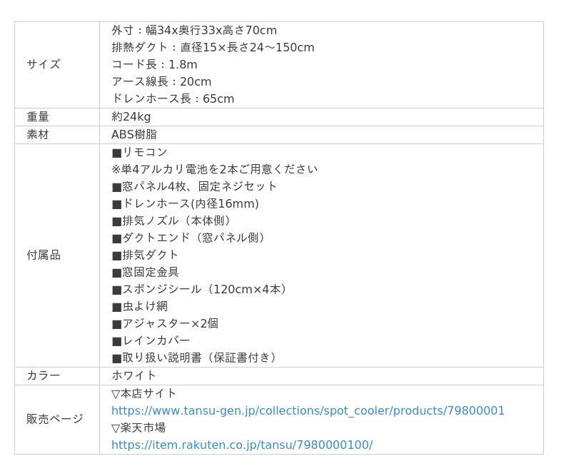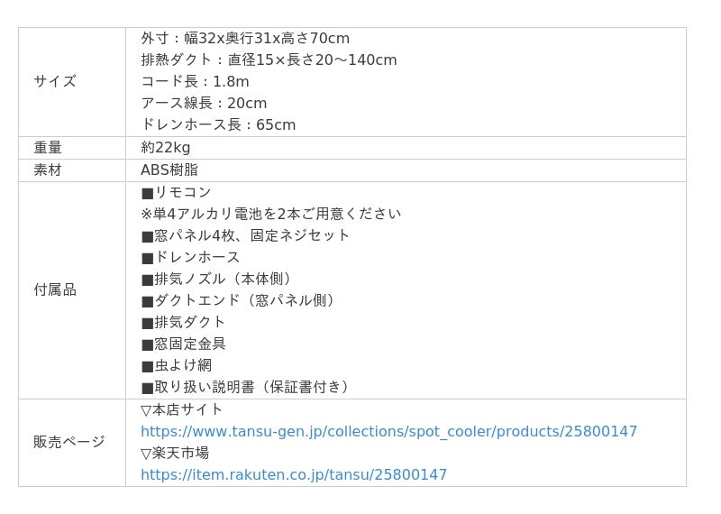 『スポットクーラー 超強力猛暑対応モデル』と『スポットクーラー 木目デザインモデル』はどちらもタンスのゲン本店とタンスのゲン楽天市場店に取り扱っております。詳細は販売ページをご参照ください。
