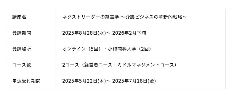 【2025年度募集】小樽商科大学ビジネススクール「ネクストリーダーの経営学 ~介護ビジネスの革新的戦略~」第2回の募集を開始しました。