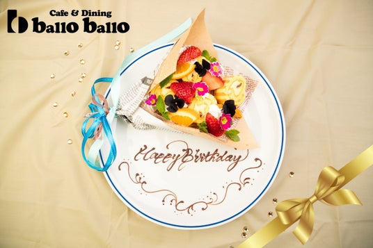 お皿にのせられた、カラフルな花束の中身はフルーツ&ケーキのスイーツ!もちろんプレートにはチョコレートで書いたメッセージを添えて、特別な時間を演出します。今まで沢山のお祝いをお手伝いしてきたballo balloの料理長がデザインした自信作「花束アニバーサリープレート」で是非思い出に残るひとときをお過ごしください。毎年お祝いに使っていただいているお客様にも、これから初めてお店をご利用いただくお客様にもきっとご満足いただけるサービスです。