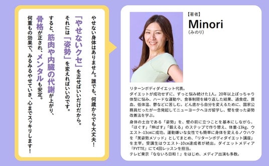 著者のMinori氏も、ダイエットが成功せずに、ずっと悩み続けた1人。身体の土台である「姿勢」を作り替えたことで、体重を13kg、ウエストを13cm落とすことに成功しました。その体験をもとに、運動が苦手な人でも実践できる「やせ姿勢」を確立しました。