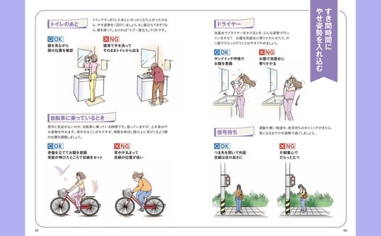 ▲トイレのあとや信号待ちなど、毎日のふとした瞬間に「NG」な姿勢になっていませんか? 毎日のすき間時間に「OKなやせ姿勢」を取り入れましょう。