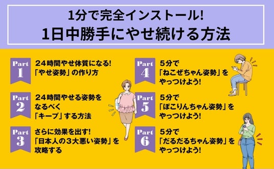 さらに、日本人にありがちな3つの代表的な悪い姿勢――「ねこぜちゃん」「ぽこりんちゃん」「だるだるちゃん」を徹底分析し、それぞれのタイプに合わせたケア方法をわかりやすく解説しています。自分のクセを知って修正すれば、姿勢は自然と整い、1日中やせ続ける身体が手に入ります。
