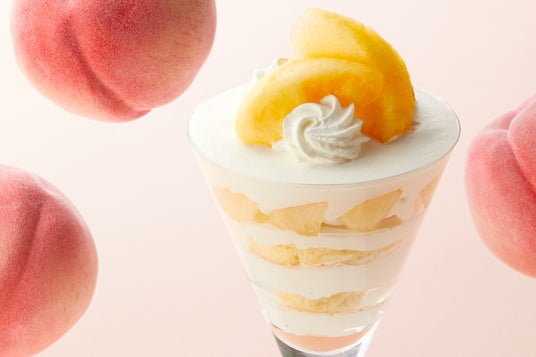 グラスの中にはスポンジとホイップクリームを3層に重ね、間には桃の果肉も詰めています。全体的に軽い仕立てで、ボトムのピーチジャムが最後まで桃の味わいを感じさせます。添えてある桃の果肉は、お好きなようにカスタムしてお召し上がりいただけます。