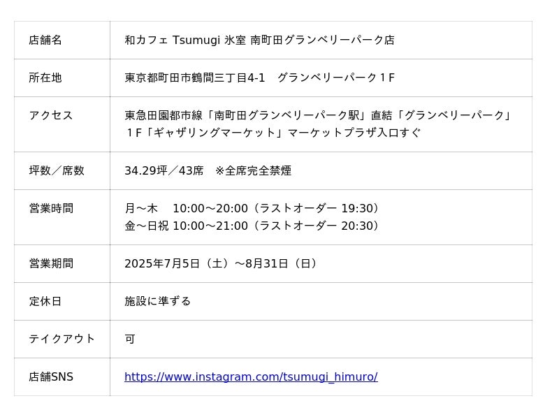 株式会社プロントコーポレーション(本社:東京都港区、代表取締役社長:杉山和弘)は、『和カフェ Tsumugi 氷室(ツムギ ヒムロ) 南町田グランベリーパーク店』を、2025年7月5日(土)から 8月31日(日)までの期間限定で営業いたします。