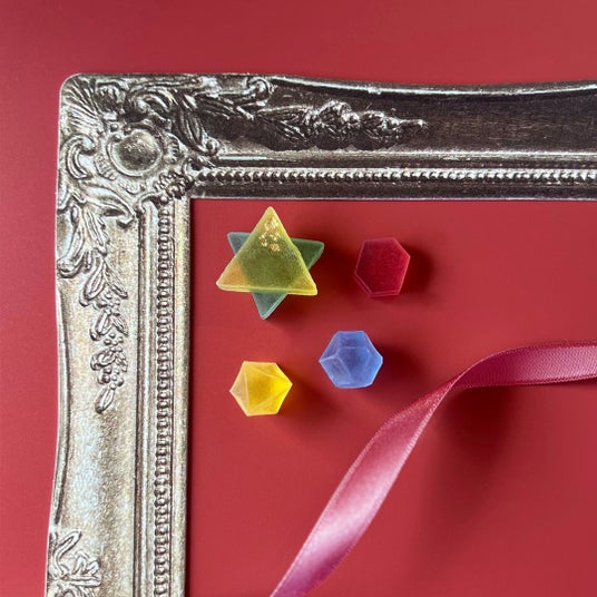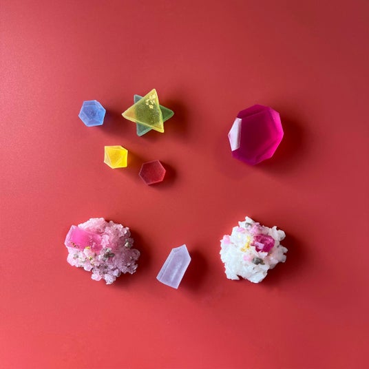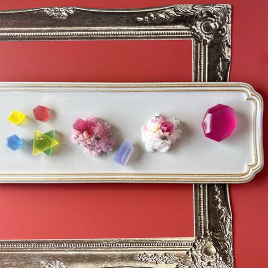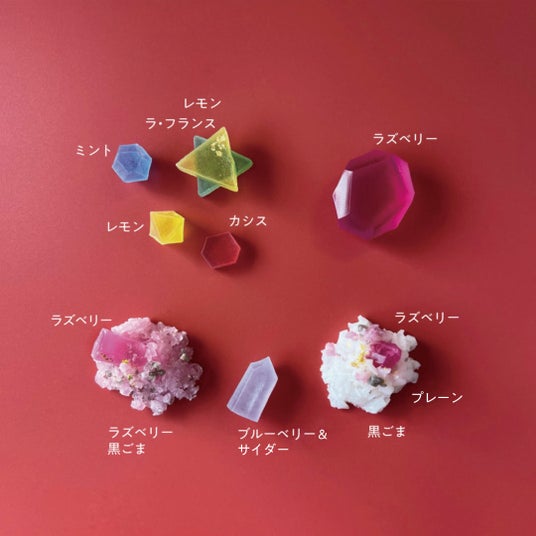 ルビーの赤い表現を引き立てるべく、青や赤などの色を使った鉱物も一緒に構成しました。見た目の美しさだけでなく、色ごとに味が違うのも特徴。味も裏切らないを目指した、ハラペコラボの琥珀糖こうぶつヲカシ。青はミント、水色はサイダー、黄色はレモン、緑はラ・フランス、濃い赤はカシス、紫はブルーベリー、黒は黒ゴマとメインのルビーに使われているラズベリーの他にも食べ応えのある構成になっています。