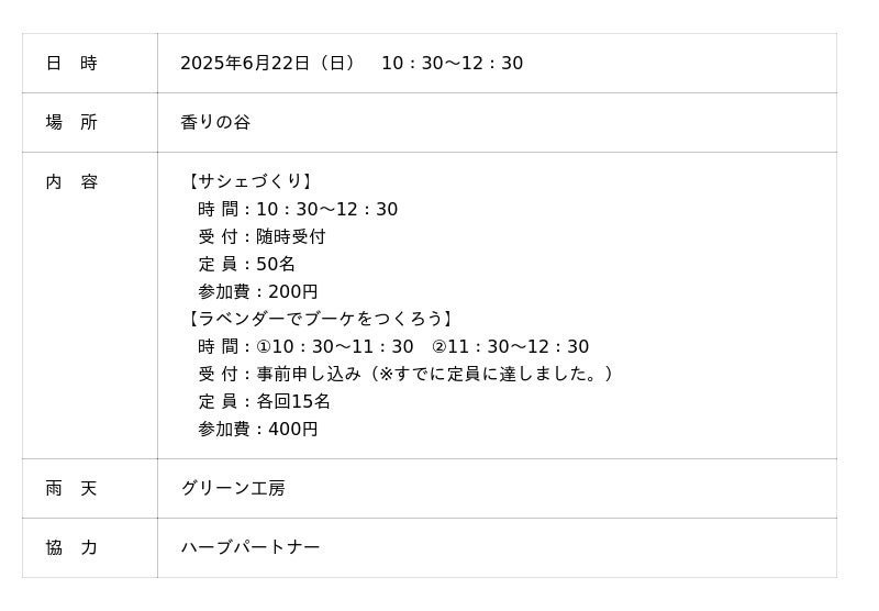 ラベンダーの見頃に合わせ、公園ボランティアの「ハーブパートナー」が中心となり、各種体験イベントを開催します。“サシェづくり”や“ラベンダーでブーケをつくろう”など、ハーブの魅力や日常に取り入れるヒントをご紹介。作った作品は、そのままご自宅に持ち帰りいただけますので、ご家庭でもラベンダーの香りをお楽しみいただけます。