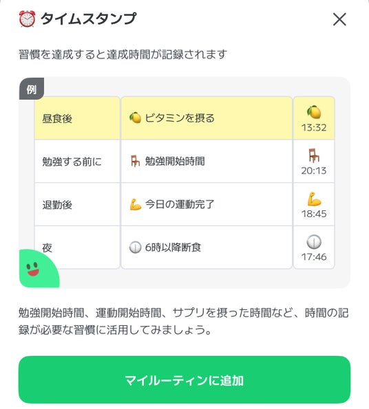 歩数記録だけではなく、ルーティンをチェックするだけで完了時間が自動保存されるタイムスタンプ機能と組み合わせることで、より高度な健康ルーティンのトラッキングが可能に。