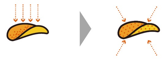 「ポテトチップス うすしお味」などのポテトチップスは生のジャガイモをそのままスライスして油で揚げています。対して、成型ポテトチップスの「クリスプ」は、乾燥したジャガイモをマッシュポテトのように潰してフレーク状にしたものを成型し、油で揚げています。原料や製法が違うため、味や見た目、食感が異なります。