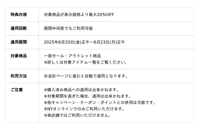 期間中、対象アイテムをご購入で最大20%OFFとさせていただきます!この夏活躍する半袖トップスやワンピース、クールビズアイテムなど、今ならセール価格からさらにプライスダウン!NYオンラインだけのこのお得な機会をお見逃しなく。